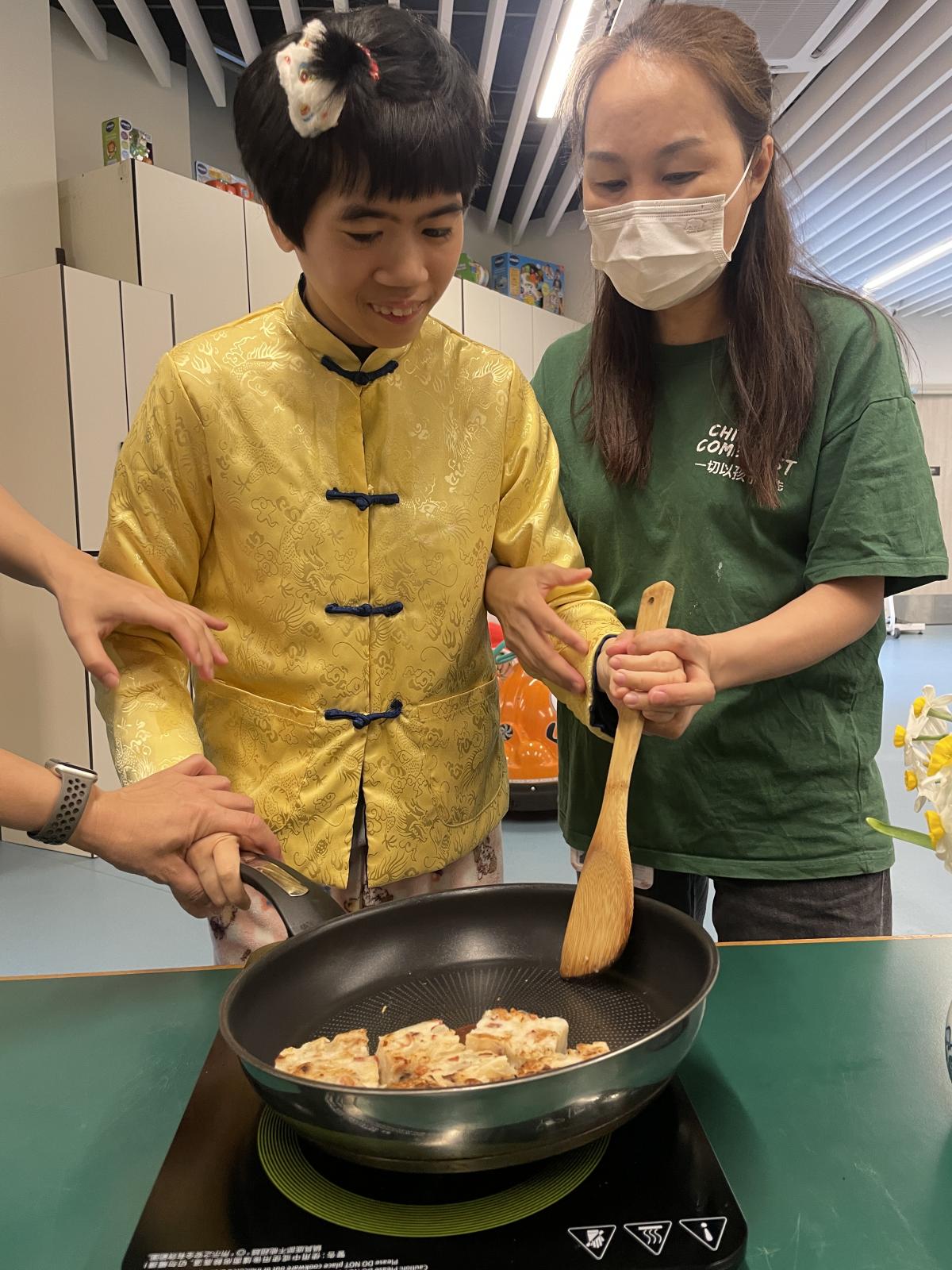 最後,大家與宿生們一起煎蘿蔔糕,並共享這道用自家種植有機蘿蔔製成的美味,歡慶新春。