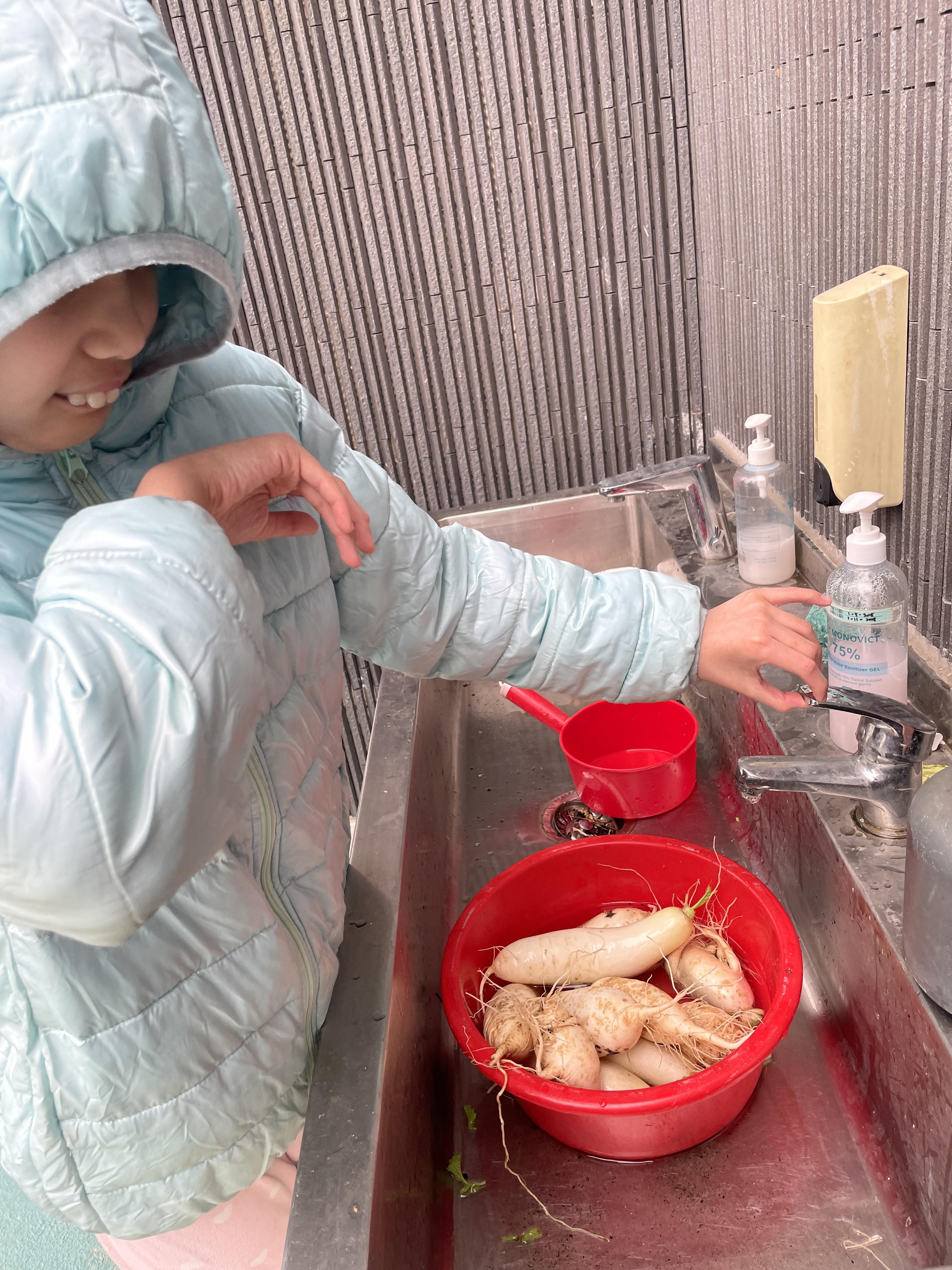 我們從開懇耕地開始,將平日的廚餘保存起來制作成有機肥料,再把有機肥料放入泥土中,讓蘿蔔獲得充足的養份成長;在小農夫們淋水與施肥的照相機下,三個月後,白蘿蔔終於冒出來。小農夫協助採摘並清洗白蘿蔔,接著將蘿蔔製成蘿蔔糕。