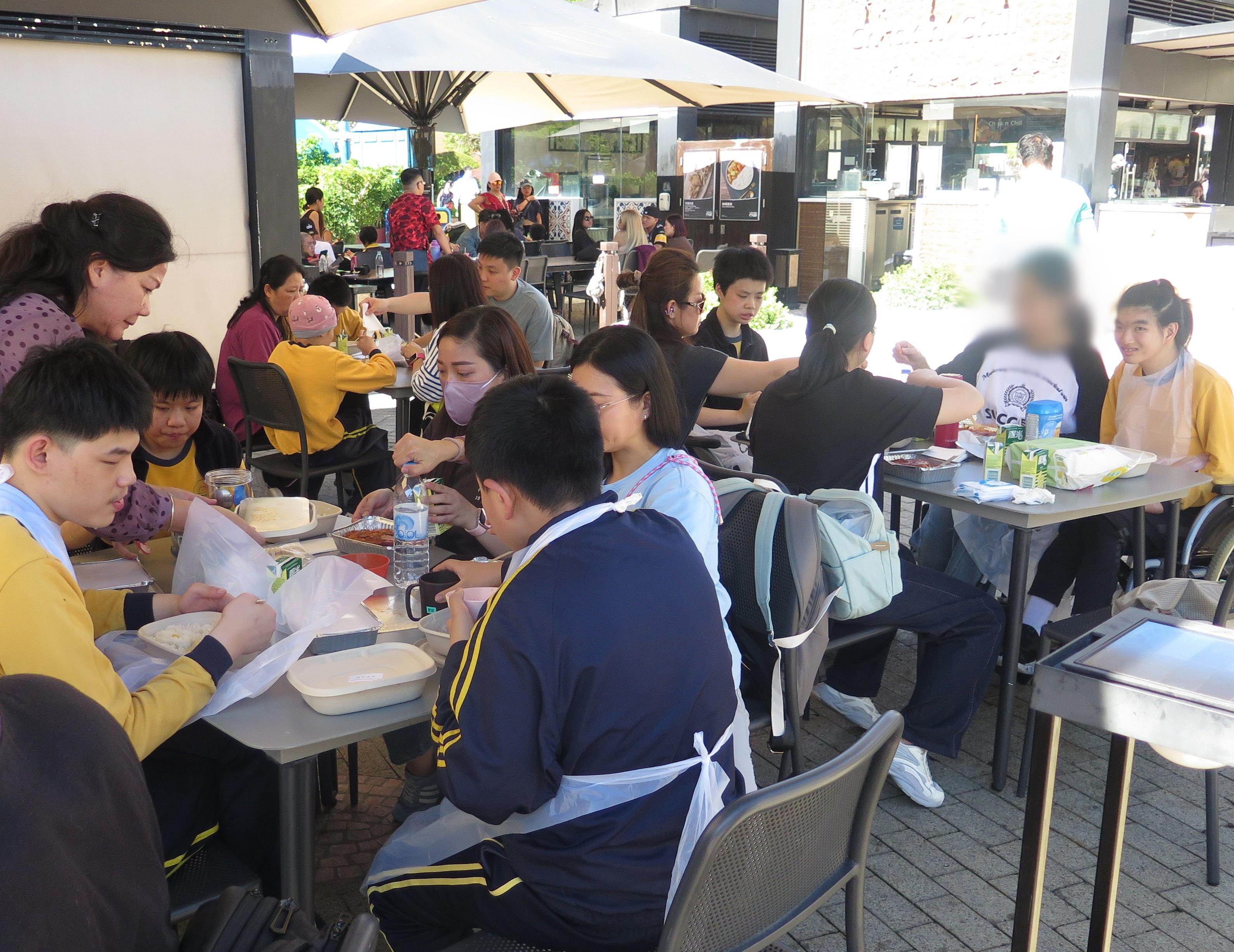 到了午餐時段,我們一起在戶外遮陽傘下共進美食。微風吹來,教職員、家長、學生共享時光,甚是寫意。而且,同學們在進食後,更能自覺收拾,充分彰顯和實踐「責任感」、「承擔精神」、「孝親」等價值觀的態度和行為。